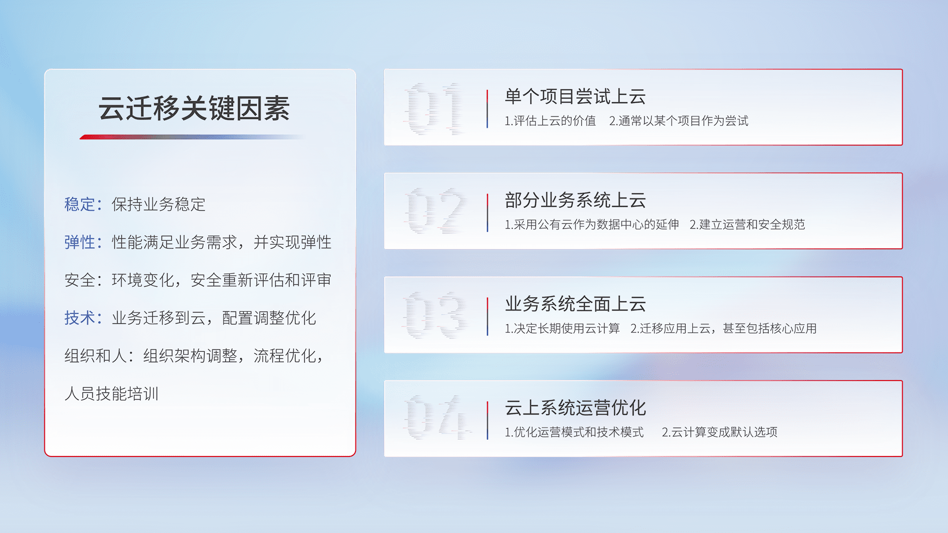 结合实际业务,,,,从规划设计、、云平台选型、、云原生改造、、、数据迁移、、集成交付,,,,迁移全过程为客户识别最佳上云路径,,,,做好风险识别管理,,设计网络架构、、、、身份权限、、、、安全审计合规、、、操作审计、、、、日志审计、、监控告警策略、、、多站点容灾设计等,,,对云上基础设施进行整体规划,,,,提升IT治理水平,,,,以满足弹性、、、、高可用、、、、高性能的需求。。。。