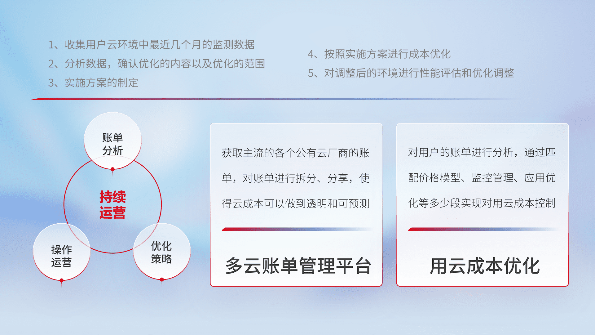 通过多云纳管,,以统一的资源数据模型把客户的云资源进行抽象和封装,,,,进而实现对多云资源的统一操作,,保障云资源管理的可靠性、、稳定性与可用性。。量身定制化运维内容,,配置、、、、开发运维、、补丁管理、、、、备份、、、监控、、认证和访问管理、、、审计和日常巡检等,,,,保障在用云过程中的可靠度,,,,稳定度以及高可用率。。。